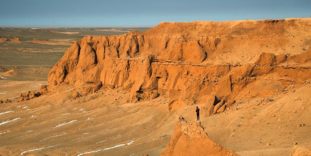 En este día atravesaremos el enorme paisaje abierto conocido como la estepa de Ongi, una llanura de más de 80 km de ancho situada en la zona del Gobi. Llegaremos al mediodía a Bayanzag, también llamado los Acantilados Llameantes (Flaming Cliffs). Esta área es famosa por contener fósiles excepcionales de dinosaurios en pleno corazón del Desierto del Gobi.